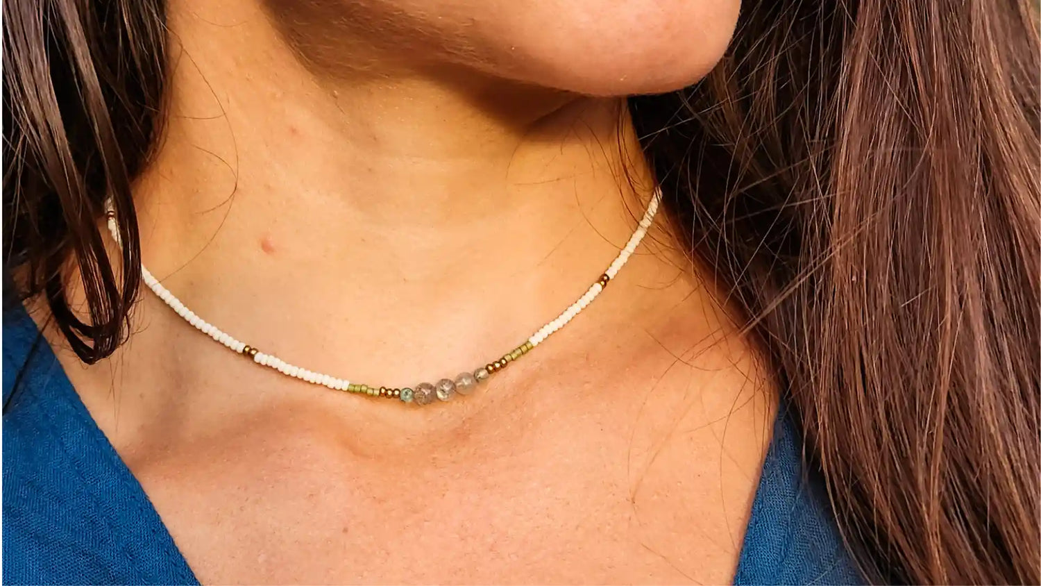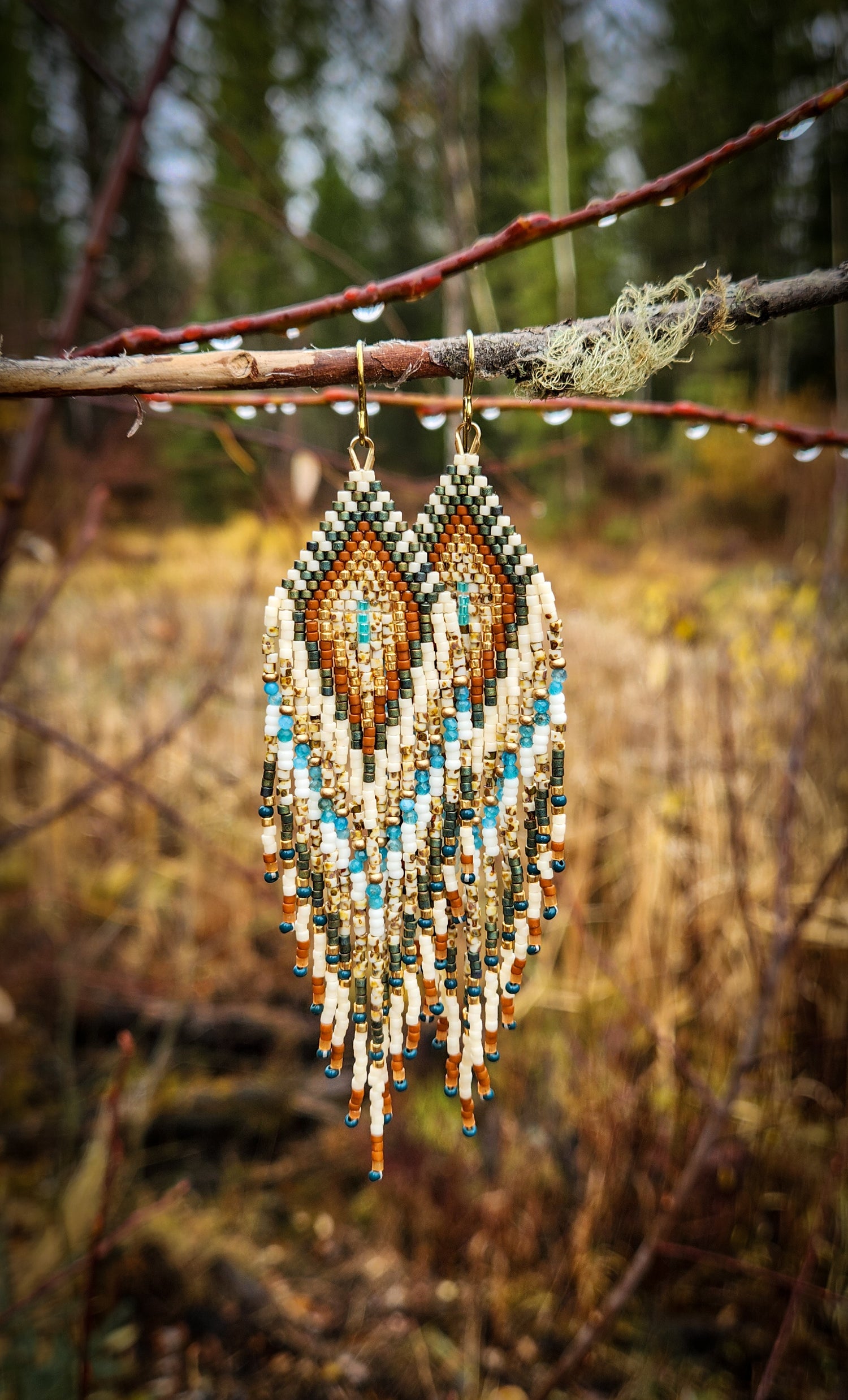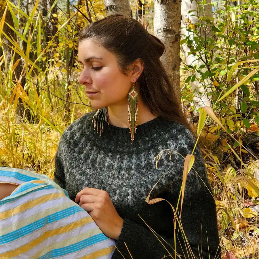 Each of Sacred Creations’ adornments are intentionally handwoven and/or threaded with the highest care using predominantly Japanese and Czech glass seed beads but also semiprecious gemstones. While most of the Japanese glass seed beads are relatively uniform, many of the stone beads are unique in both shape and color thereby offering a uniquely distinct look to many of the pieces. Always wear the earring backings provided with your earrings- I can no longer make up singles to match a lost pair due to the time and effort it takes to source the exact beads used at the time of original creation. When not wearing your earrings, store them laying flat or hanging so as to keep the fringes straight. The nylon thread is highly durable but has a memory and will retain kinks and bends. Should your earring fringes get a little bit kinked, gently roll them between the fingers a bit and proceed to storing them straight- over time they should re-straighten. Avoid getting your beaded wares wet. The beaded chokers are a little less forgiving if bent. While they are made with the most durable and flexible micro wire, severe kinks are often hard to reverse. Treasure your piece with the highest love and care and they will hold up for years!