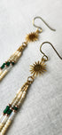 Bright and enchanting, these fine handcrafted seed bead danglers will add an exceptional glow to your day. Featuring light green Peridot stones, golden brass sun charms, and emerald glass this simple design is perfect for everyday wear.