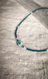 The Delphine seed bead choker emanates a sweet, delicate elegance; deep emerald teal with a touch of shimmering white satin glass and sterling silver beads surround the majestic Azurite stone in the center. A perfect piece of eye-capturing simplicity that can layer perfectly, or worn on it's own.